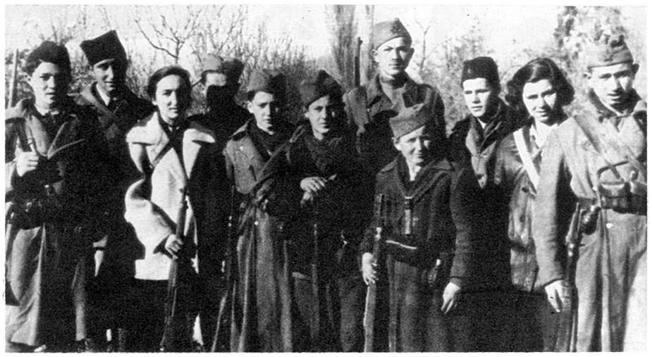 Boško Buha, četvrti zdesna, u društvu saboraca iz Druge proleterske brigade, decembra 1942. godine. Izvor slike: Yugopapir.