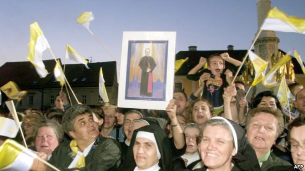 Časne sestre mašu zastavicama Vatikana i drže sliku na kojoj je Alojzije Stepinac, Zagreb, oktobar 1998.Caption